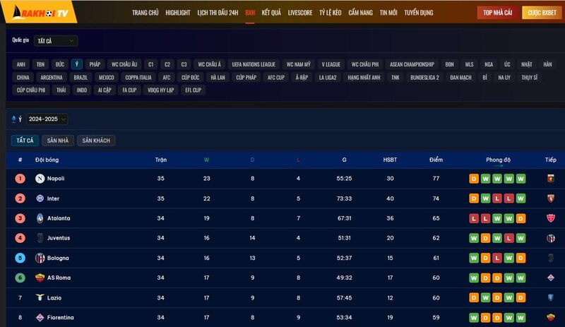 Ngoài phát sóng trận đấu, Ra Khoi TV còn được đánh giá cao bởi chuyên mục cập nhật bảng xếp hạng bóng đá Ý. Nếu bạn là fan của Inter, Napoli hay Milan thì đây là nơi không thể thiếu. Bảng xếp hạng được cập nhật nhanh chóng theo từng trận đấu, phản ánh chính xác phong độ từng đội.
