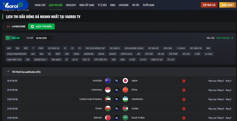 - Bảng xếp hạng và Tin tức: Vaoroi TV cung cấp bảng xếp hạng chi tiết theo từng giải đấu, cập nhật theo thời gian thực, giúp bạn theo dõi thứ hạng các đội bóng. Đi kèm là các bản tin nóng, nhận định chuyên sâu và thông tin bên lề trận đấu.